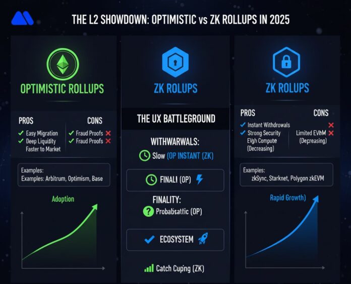 Tương lai của Optimistic Rollups vẫn rất tươi sáng, nhưng cũng đầy cạnh tranh. Các nhà phát triển đang tìm cách giảm thiểu thời gian chờ rút tiền thông qua các giải pháp cầu nối thanh khoản (liquidity bridges) hoặc hệ thống “thoát ngay lập tức” (fast exits). Đồng thời, Optimistic Rollups phải đối mặt với sự cạnh tranh mạnh mẽ từ ZK-Rollups, một công nghệ mở rộng khác sử dụng bằng chứng không kiến thức (zero-knowledge proofs) để đảm bảo tính hợp lệ của giao dịch mà không cần chu kỳ thách thức. ZK-Rollups hứa hẹn thời gian rút tiền nhanh hơn và bảo mật mạnh mẽ hơn.